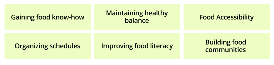 1. Removing barriers to accessing food and food knowledge by providing food navigation supports.
