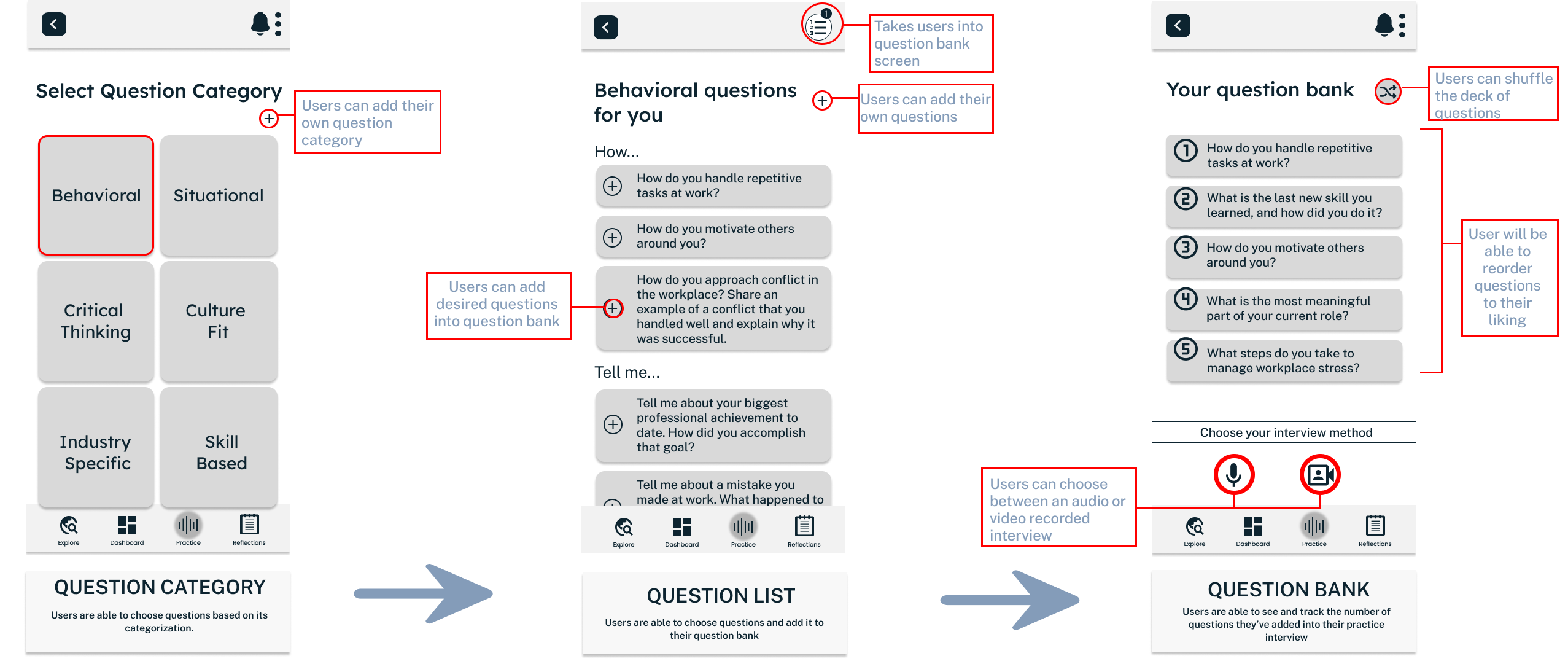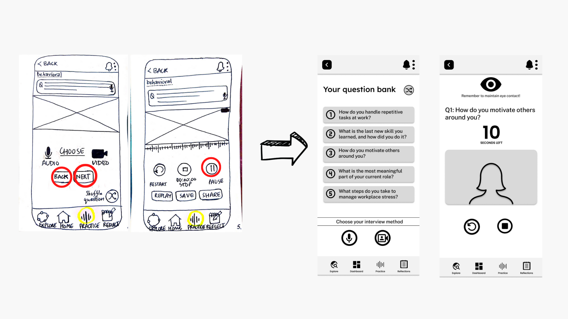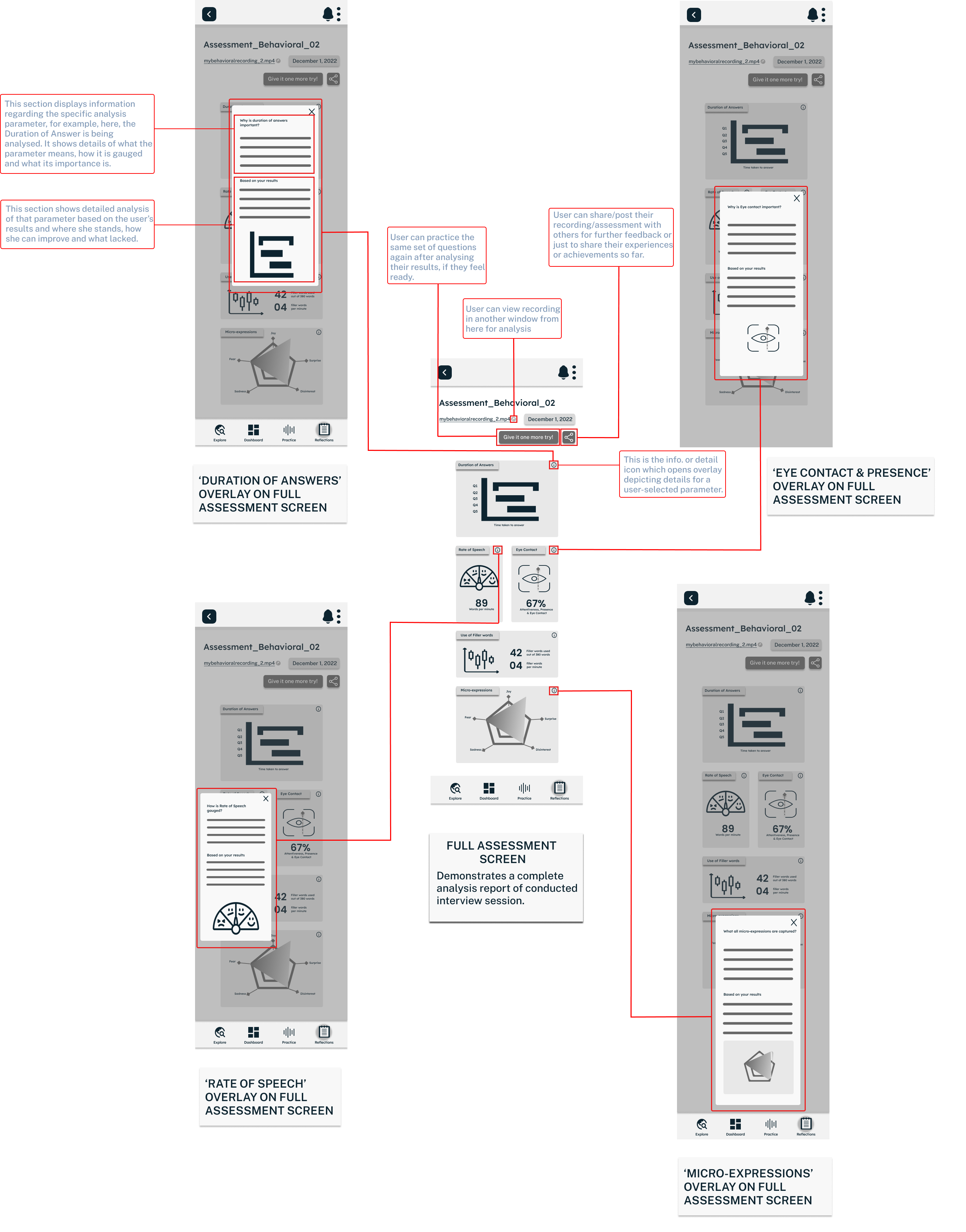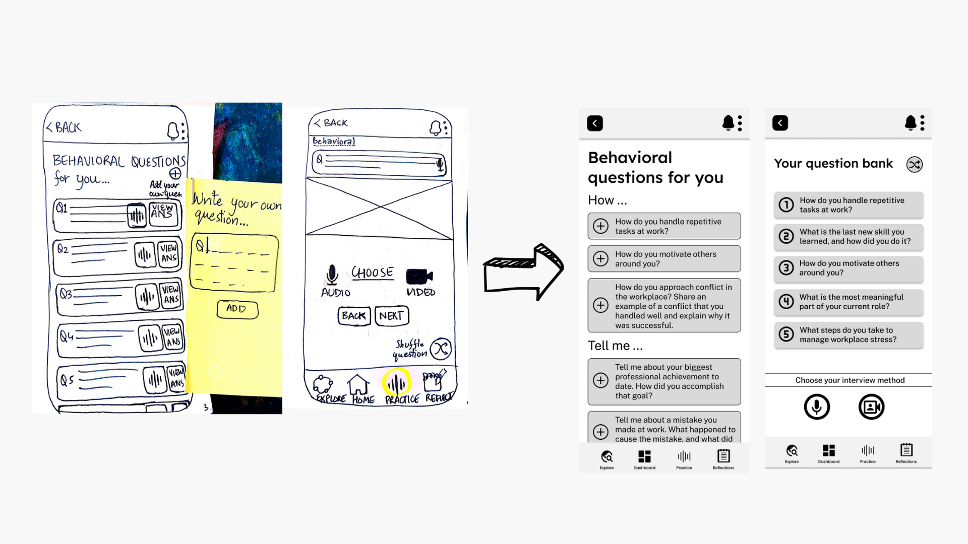 In order to actualize the vision, a framework for the solution was created to meet the needs of the users. The overall experience and flow were designed keeping in mind the combination of interactive elements as well as static interview components. The aim is to provide users with the best of both worlds.
