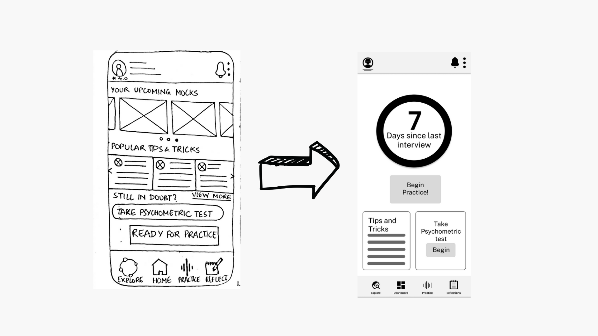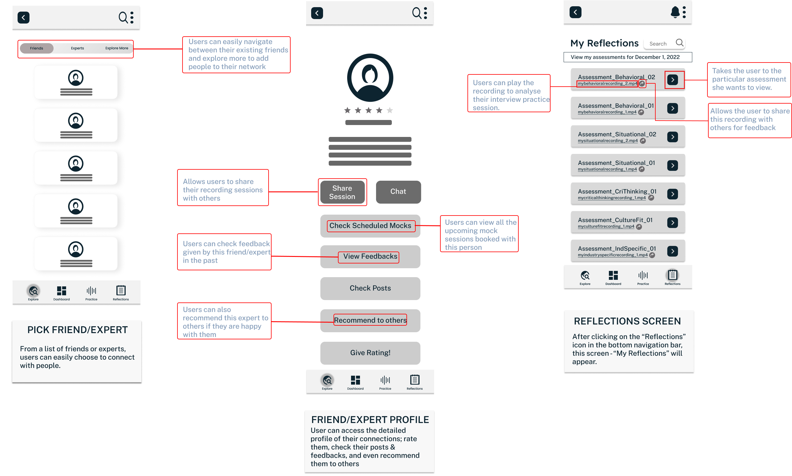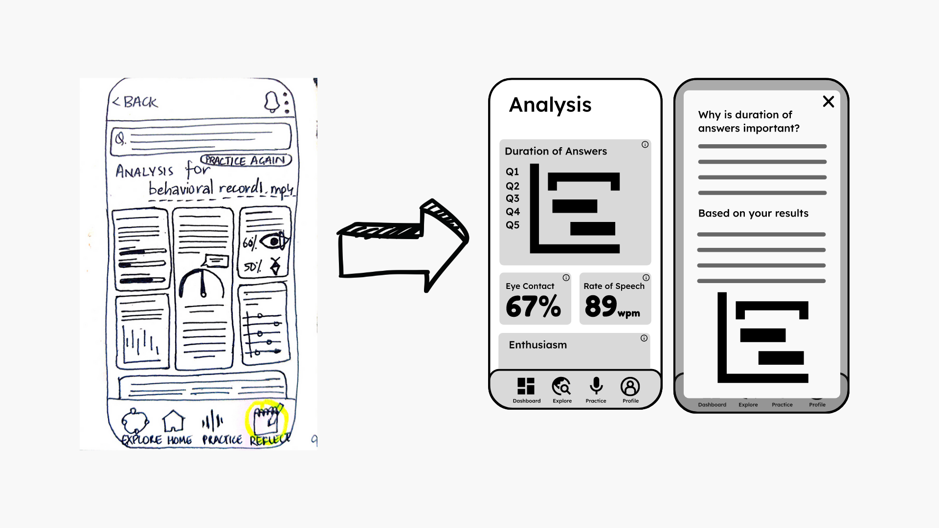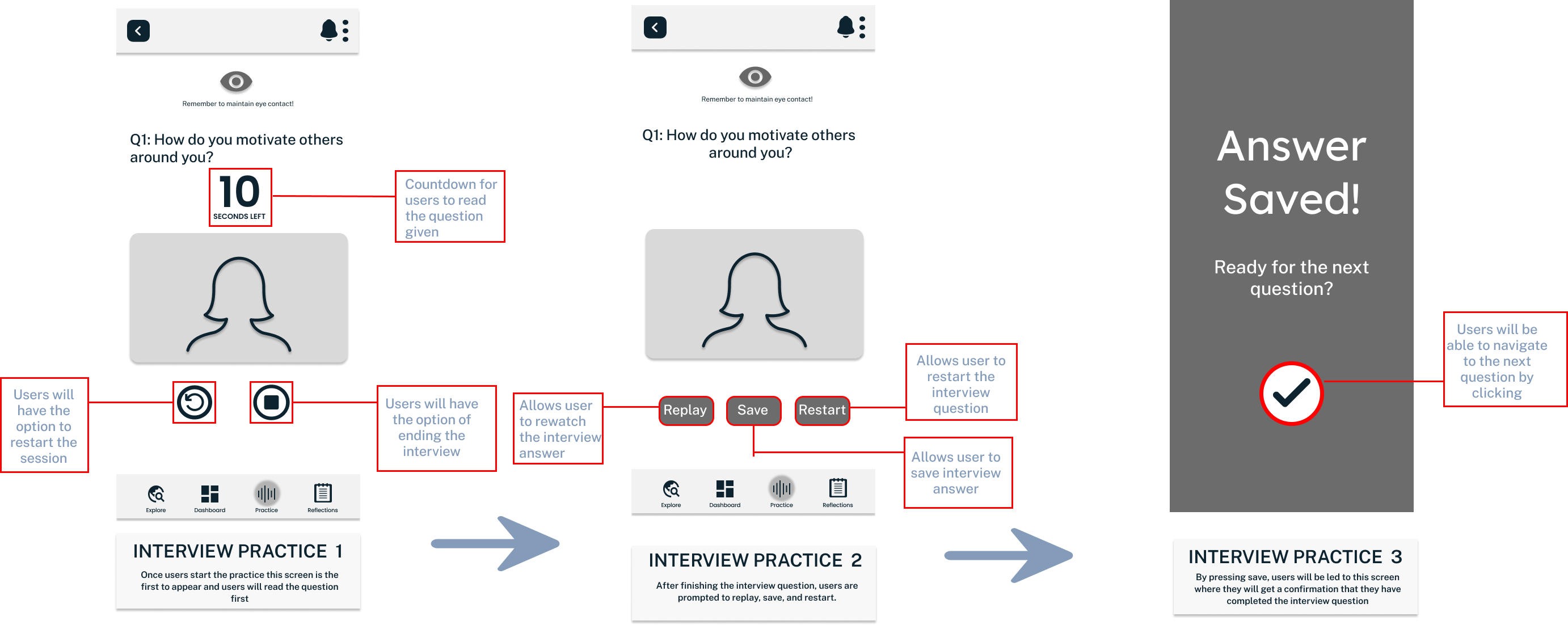 In order to actualize the vision, a framework for the solution was created to meet the needs of the users. The overall experience and flow were designed keeping in mind the combination of interactive elements as well as static interview components. The aim is to provide users with the best of both worlds.